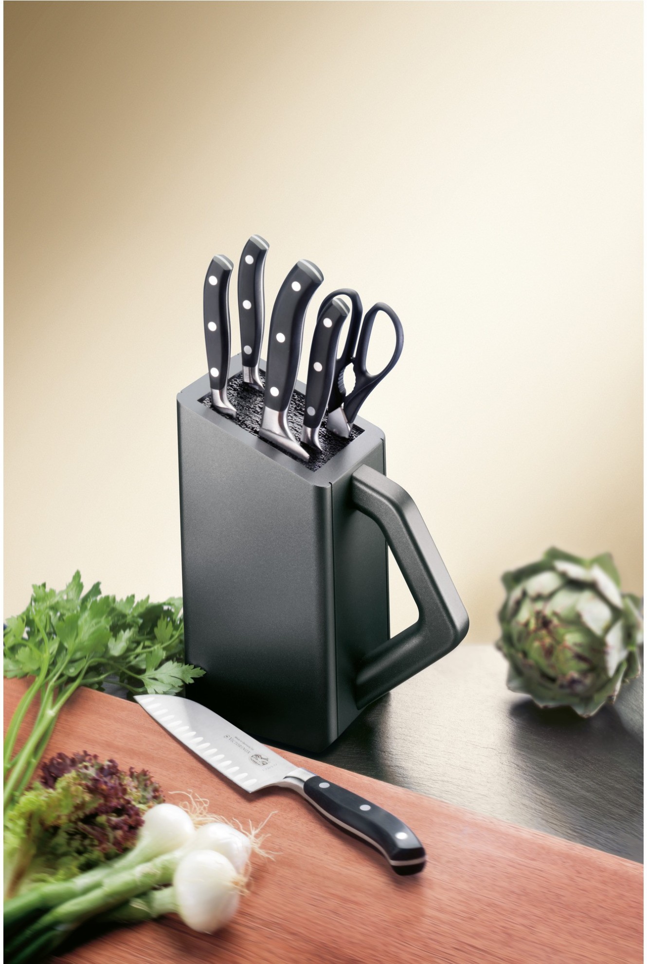 Blok wykonany z bukowego drewna polakierowany na kolor antracytowy. W zestawie z 5 kutymi nożami oraz nożyczkami