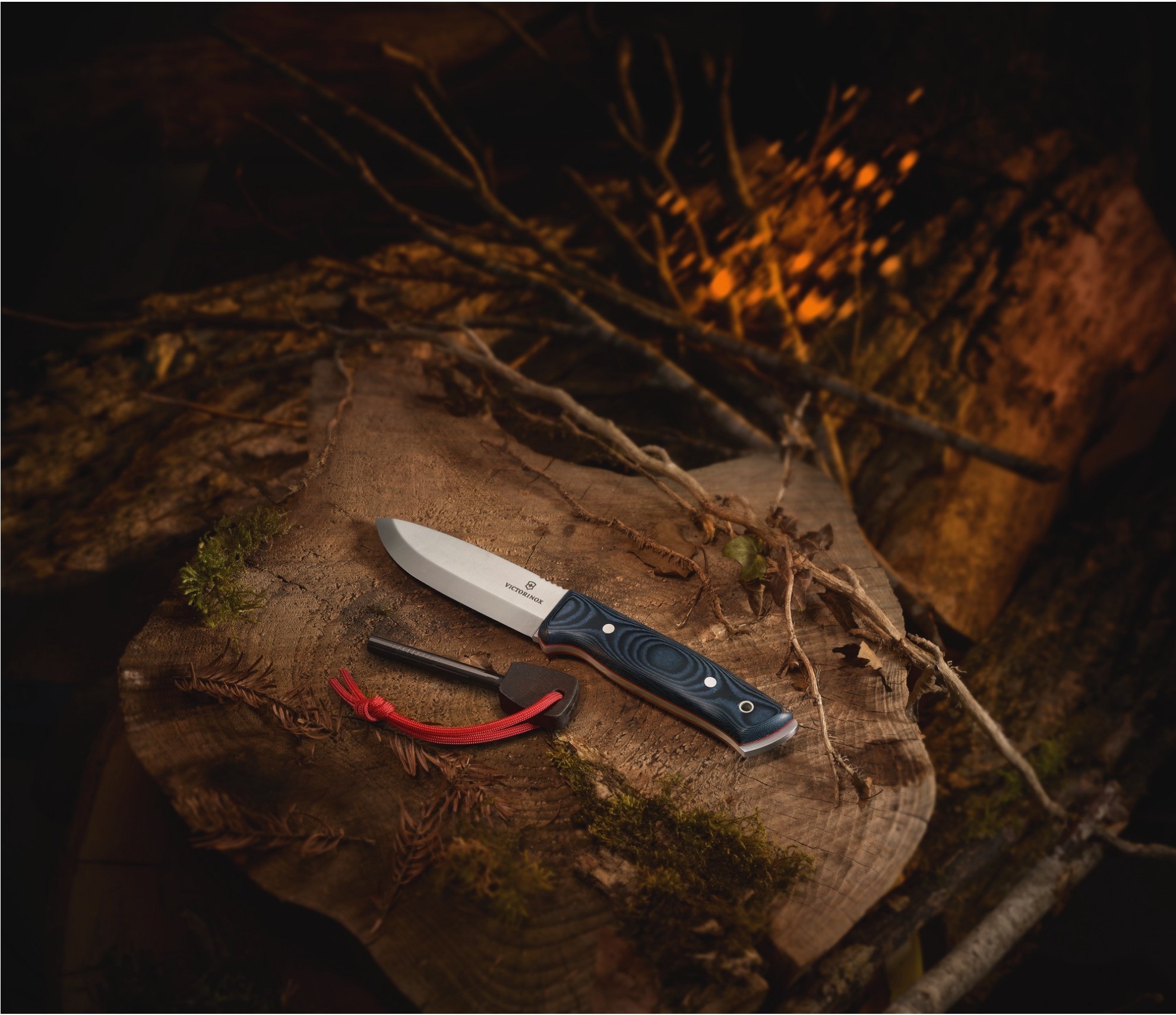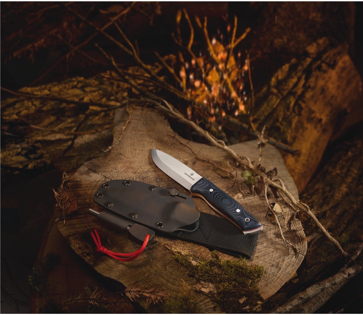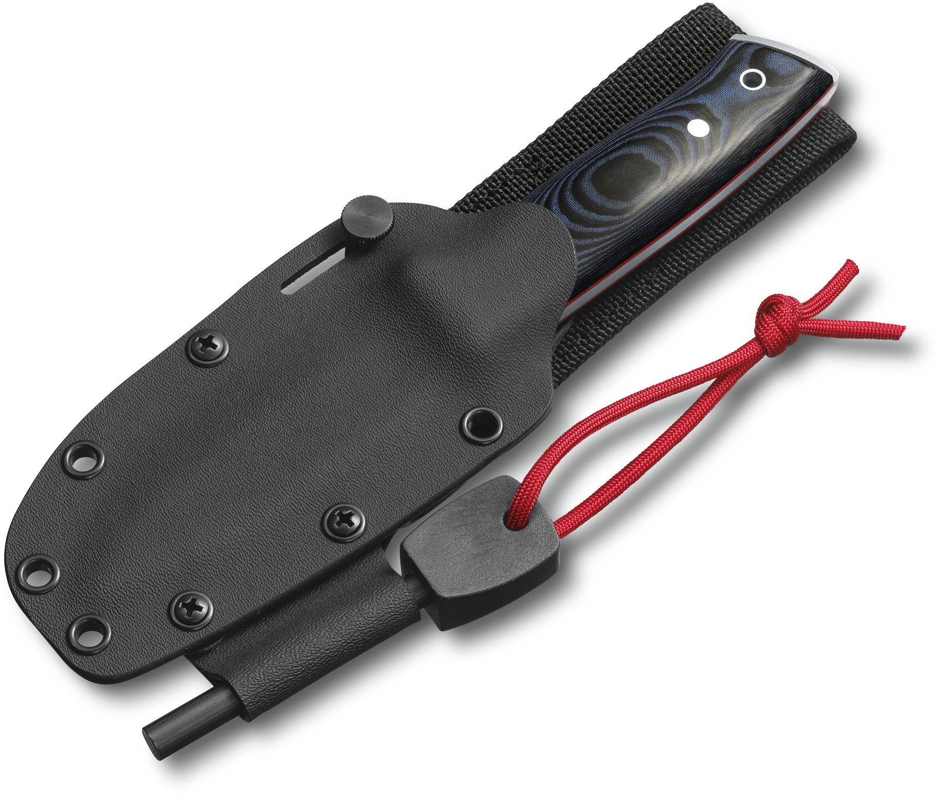 Nóż z oprawą z Micarty z niebiesko-czarnym wykończeniem w zestawie z ochronną pochwą z kydexu oraz krzesiwem.