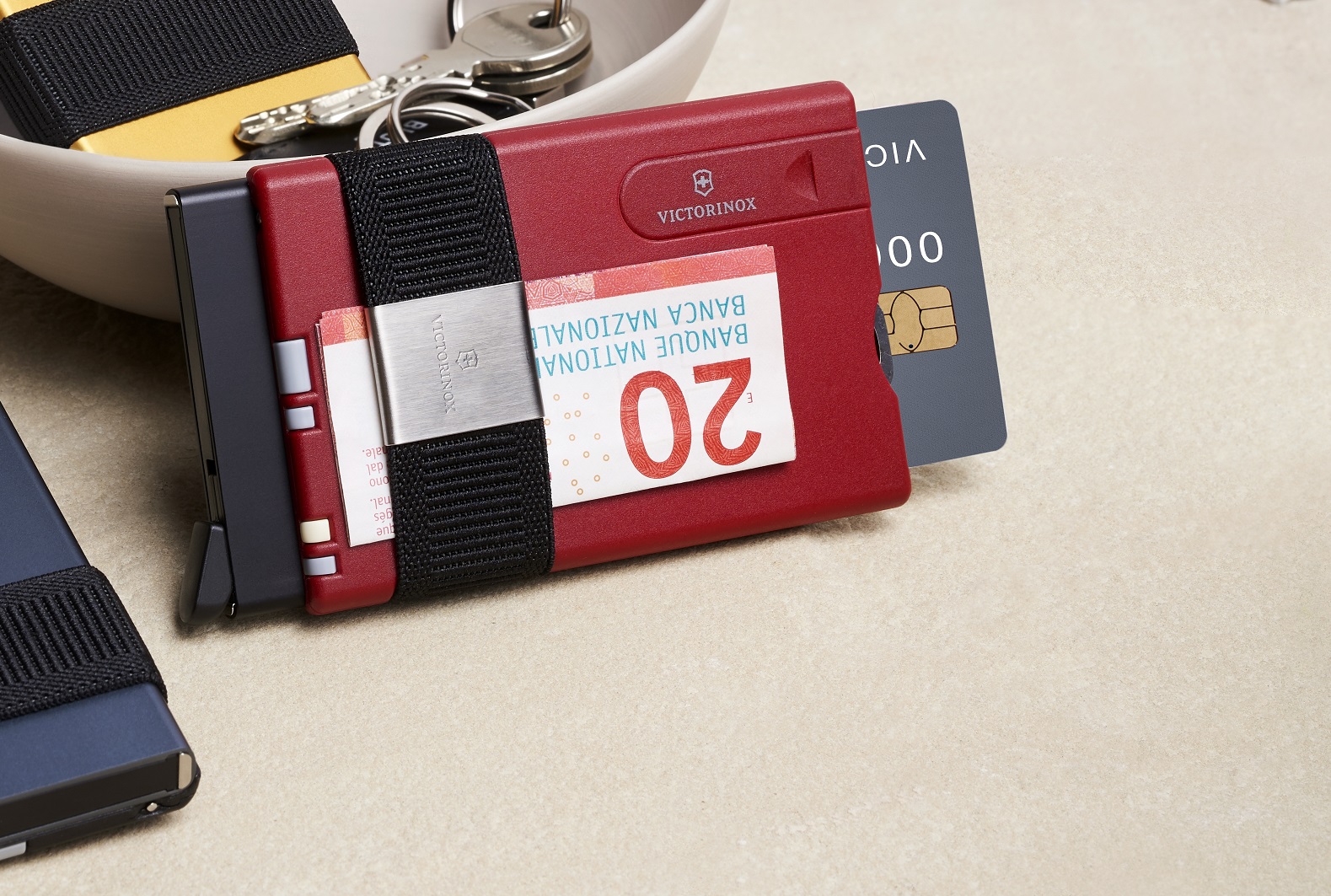 Etui ochronne na karty / Opaska na banknoty / Małe ostrze / Nożyczki / Pilniczek do paznokci | Śrubokręt 2,5 mm / Szpilka / Pęseta / Wykałaczka / Długopis z wkładem napełnianym pod ciśnieniem / Pilniczek do paznokci